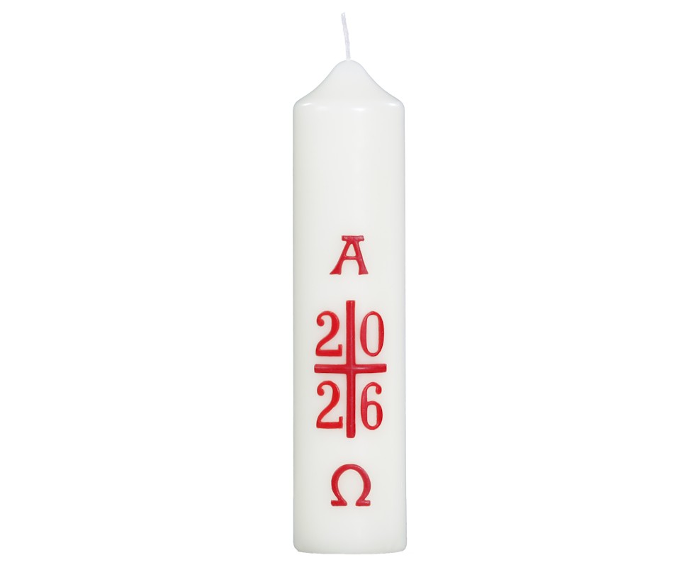 Ostertischkerze mit rotem Kreuz. Eine Kerze mit bestem Brennverhalten, die Symbole aus Wachs sind in Handarbeit aufgelegt
