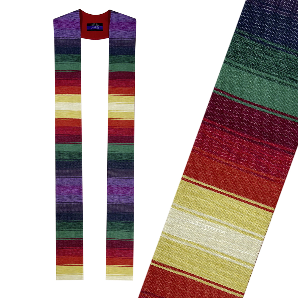 Stola in Regenbogenfarben gewebt in den liturgischen Farben. Die Stola hat einen farbig gewebten Verlauf und bildet die liturgischen Farben des Kirchenjahres ab.